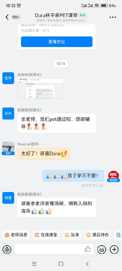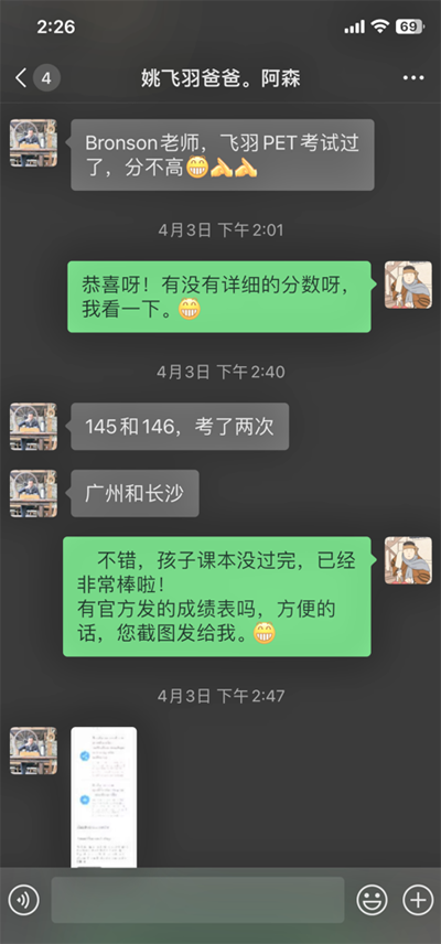曹欣悦参加一对一PET冲刺班,Maxine老师严格的教学计划,最终PET取得了164高分。