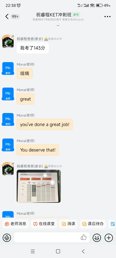 祝睿程同学参加英普乐思KET一对一冲刺课,Mona老师授课,课程吸收能力比较好,最终取得了143分,KET卓越的成绩。