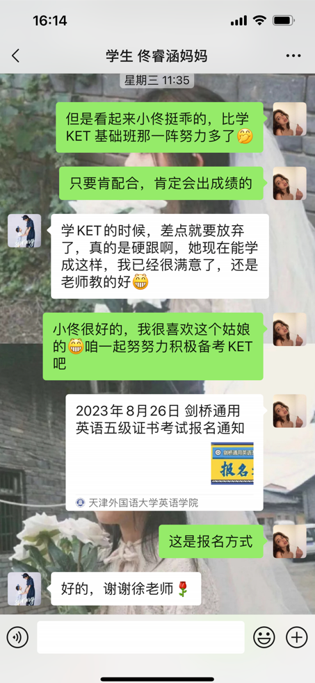 佟睿涵同学刚开始学习KET基础班时,基础比较薄弱,经过4个月学习时间后,孩子模考A2通过水平,也参加了KET考试,成绩为126分,顺利进阶到PET学习。