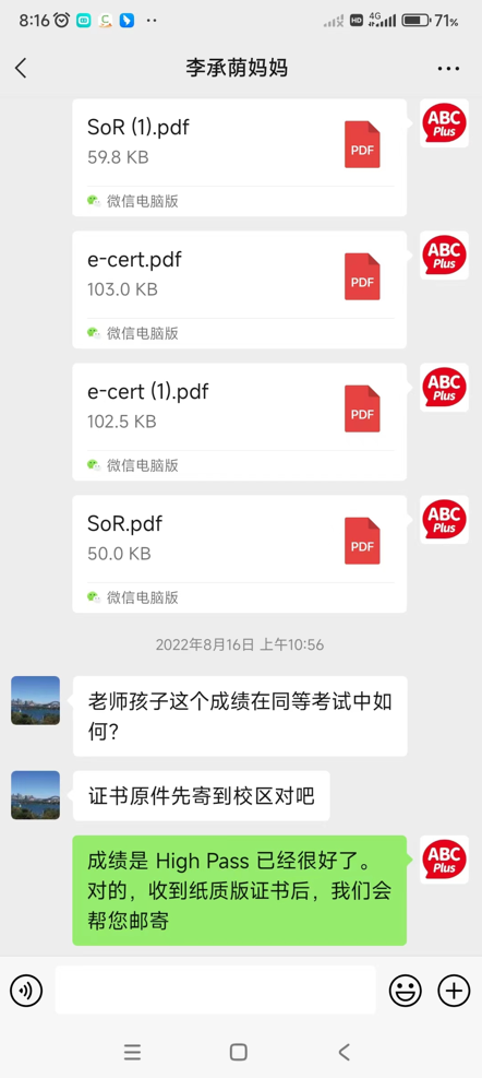 李承荫同学参加了FCE一对一基础班学习,由于MSE本地考试延期,于是参加了朗思B2的考试,最终B2成绩为High Pass高分通过,尤其是口语满分。